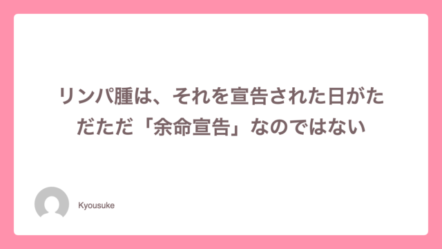 リンパ腫闘病リンパ腫は、それを宣告された日がただただ「余命宣告」なのではない 2026年2月17日 Kyousuke https://rikkusora.com/rikku/wp-content/uploads/2021/06/a290635645ff8f1e7cd84023c7eff034.png リュックと愉快な仲間たちブログ