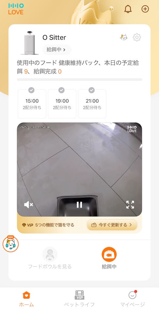 こちらのアプリから、給餌ボタンを押せば手動で上げることもできますし、ご飯の残量が少なくなってるよ〜みたいなのもわかります。