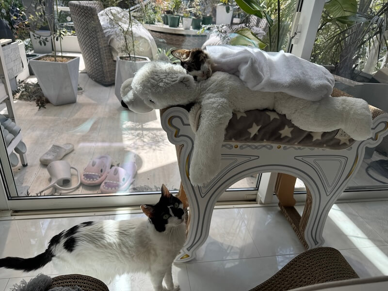 あ!ムーたんいるやん!!!ポーチーに「あのでかい猫がいるところ目指して歩けばいいからね〜」って伝えておけばいいんだ!!!