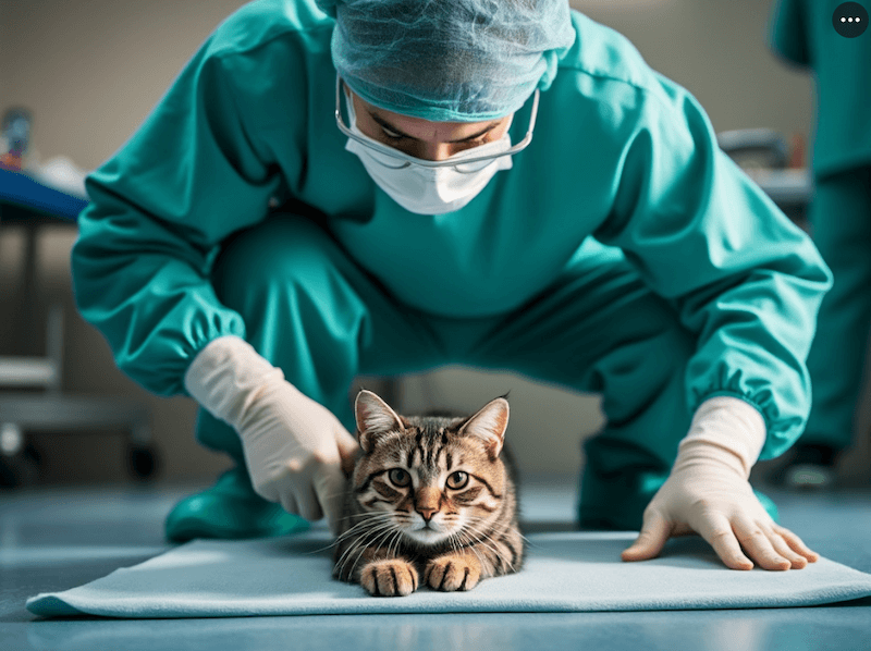 外科医みたいな格好してる奴がクラウチングスタートの体制で猫に抗がん剤をあげてる