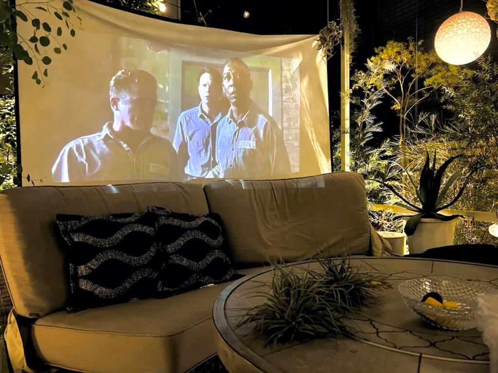 プロジェクターを設置していて、庭で映画観れるのです!