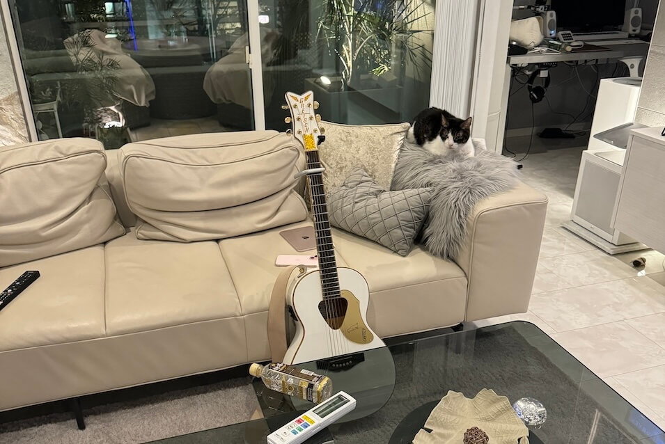 ギターを持てば、膝に来てくれるし、みんなが寝てれば一緒に寝るし、お薬の後も一緒にベッドに行くじゃん