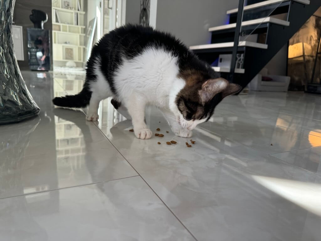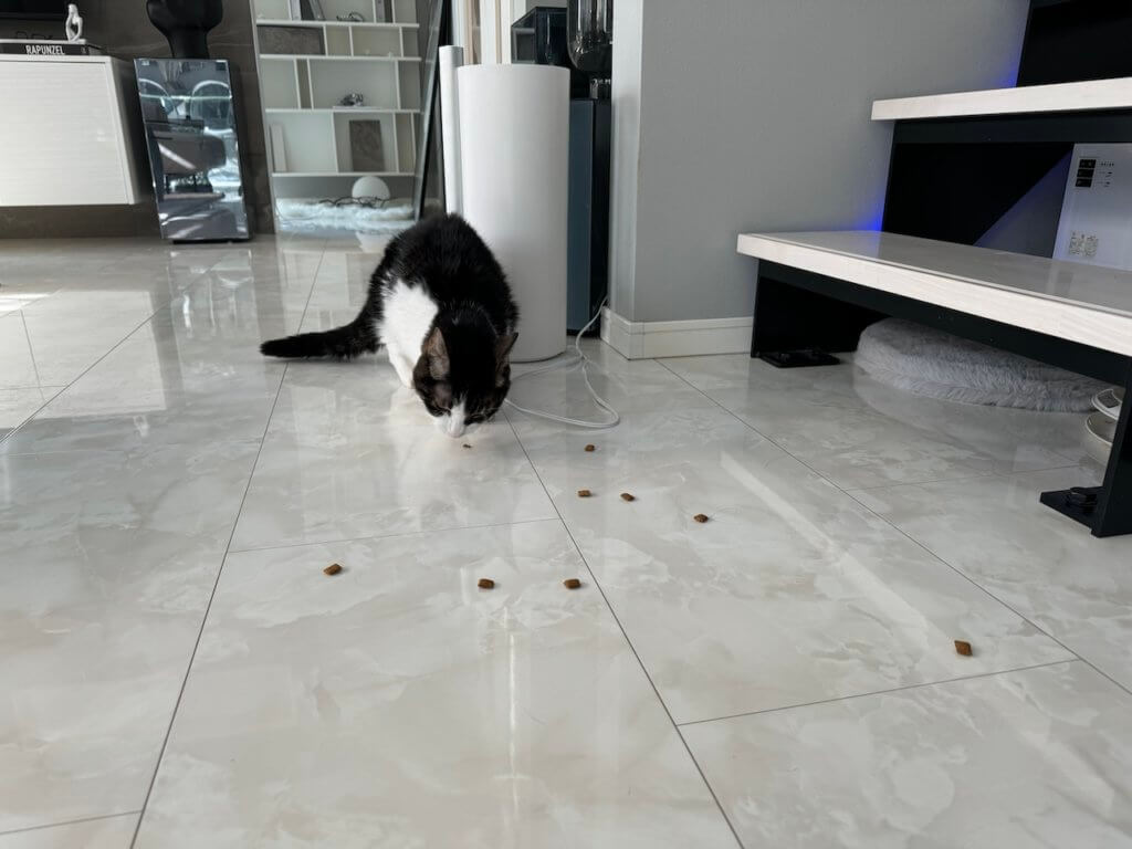 なぜかまとまった位置に出すと食べるのをやめるので、遠巻きからおやつを投げまくる